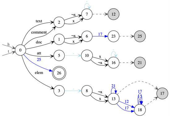 - Gauwin, O.; Niehren, J.; Tison, S. Earliest Query Answering for Deterministic Nested Word Automata. In Proceedings of the 17th International Symposium on Fundamentals of Computer Theory, Wroclaw, Poland, 2–4 September 2009; Lecture Notes in Computer Science; Springer: Berlin/Heidelberg, Germany, 2009; Volume 5699, pp. 121–132. [Google Scholar]