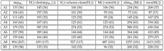 Minimization is applied by the function in the fourth column. In the case of A8, it reduces the number of states from 117 to 101 and the size from 527 to 487.