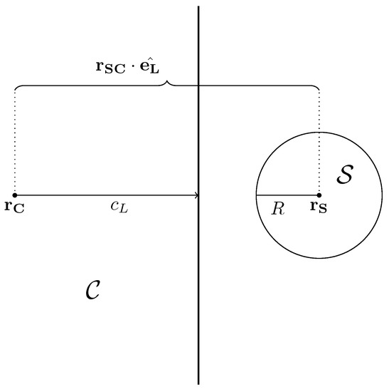 The interested reader is referred to Appendix A for a formal derivation of Equation (2). To the best of our knowledge, Arvo was the first to propose an algorithm detecting the intersection between a sphere and an axis-aligned cuboid, that is a cuboid whose orientation matches that of the reference axes [5]. For this specific case, we assume that the cuboid thickness is aligned with the x axis, i.e., , its length with the y axis, i.e., and its width with the z axis, i.e., . Following this assumption, Equation (1) can be rewritten as
