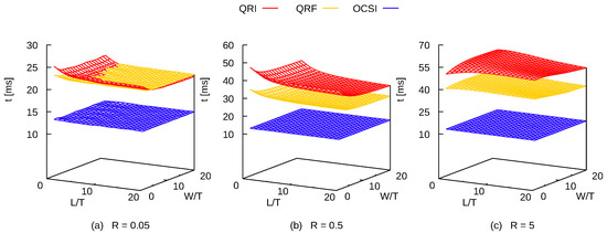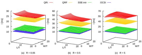 Run-times of algorithms written in C/C++ that detect collision between one cuboid of length and width and one sphere of radius (a), 0.5 (b) and 5 (c). The program was compiled using Intel® C Compiler and enabled the generation of Advanced Vector Extensions (AVX) instructions. Each test generates random configurations at constant acceptance ratio of 40%.