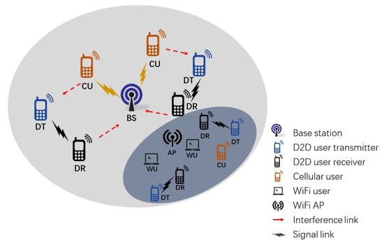As shown in Figure 1, we consider an uplink cellular network with one BS, M CUs and N D2D pairs. The m-th CU is denoted by where . The n-th D2D pairs is denoted by where , represents the n-th D2D transmitter and is the n-th D2D receiver. Furthermore, there exist L orthogonal subchannels denoted by in the system and the bandwidth of each subchannel is . The Wi-Fi network has W users operating on 5 GHz unlicensed band, and the set of the Wi-Fi users is denoted by . Moreover, there exist subchannels with bandwidth to support each Wi-Fi user to communicate with the access point (AP), and the set of the subchannels is denoted by .
