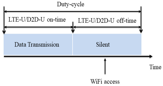 When LTE-U or D2D-U users access to the unlicensed spectrum, the Wi-Fi users will experience severe interference. To avoid the performance degradation of the Wi-Fi system and realize a fair and harmonious system, we assume that both D2D-U and LTE-U adopt duty-cycle mechanism as shown in Figure 2 [27]. The LTE-U or D2D-U users transmit data in the LTE-U/D2D-U on-time, and Wi-Fi users are allowed to transmit data in the LTE-U/D2D-U off-time to avoid collision. In this mode, LTE-U/D2D-U and Wi-Fi time division multiplexing channels are employed to achieve the purpose of fair channel occupation. The duty-cycle mechanism can be used in the areas where there is no listen-before-talk (LBT) requirement. The structure of the existing LTE BS is slightly changed, but to achieve better performance, Wi-Fi signal monitoring needs to be added to the BS. Moreover, we treat the CUs and D2D users as one type of the user on account of the CUs and D2D users have the same grade of service in unlicensed spectrum.