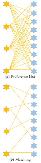Gale-Shapley (GS) algorithm was first proposed by David Gale and Lloyd Shapley to solve two types of problems, i.e., college admissions and marriage stability. The principle of GS algorithm is elaborated as follows. Members of either side have a preference list for the other members. Based on the preference lists, the active member in the one side will choose the best object to match while the chosen object can either accept the proposal or reject until it get the best proposal according to its preference list. These processes will continue until all members of the two sides reach a stable matching [31]. As thus, a stable matching will always exist in the GS algorithm.