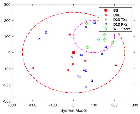 In this section, we evaluate the performance of our proposed interation-based joint user access and resource allocation algorithm by simulation results. In Table 1, we summarize the simulation parameters, which are set based on the prior works [27,28]. As shown in Figure 4, we consider a single cell network with one BS and multiple CUs, D2D users and Wi-Fi users. The CUs and the D2D users are distributed randomly in the circle area with radius of 250 m. In addition, the distance between the transmitter and the receiver of each D2D pair is no more than the required value . A Wi-Fi network is also co-located in the cellular network. We adopt the send/clear to send (RTS/CTS) mechanism working at unlicensed 5 GHz in the simulation.