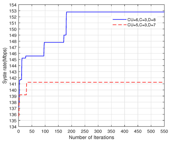 Figure 5 shows the system rate versus the number of iterations. From this figure, we can see that the system rate increases with the number of iterations ascending. Furthermore, after a certain number of iterations, the system rate tends to stabilize. Specifically, we can find that the proposed algorithm needs about 153 iterations to converge when , , , while it takes about 141 iterations to converge when . It can also be found that the number of required iterations increases with the number of users increasing. In addition, we can find that the convergence speed of the proposed algorithm is relatively low.
