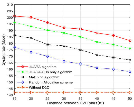 Figure 6 plots the system rate versus the distance between the D2D transmitter and the D2D receiver. In this figure, it can be seen that JUARA algorithm performs better than other algorithms in improving system rate. We can also find that the system rate decreases with the increase of the distance between the D2D pairs. This is because the increase of the distance will degrade the communication quality between the D2D transmitter and the D2D receiver.