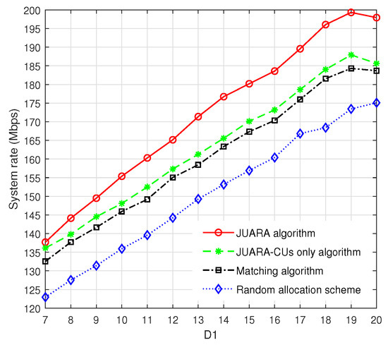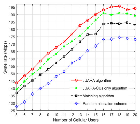 In Figure 7, we evaluate the system rate versus the number of CUs when . As shown in this figure, we can find that system rate increases with the number of CUs ascending for different algorithms. Specifically, the proposed algorithm can achieve the highest system rate than the other algorithms. Moreover, the proposed algorithm outperforms JUARA-CUs only algorithm, matching algorithm, and random allocation scheme by , , .