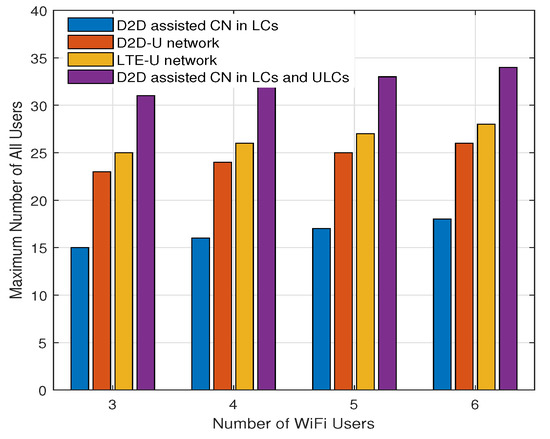 Figure 9 shows the maximum number of all users versus the number of the Wi-Fi users. The system with the least number of users is “D2D assisted CN in LS”, which is because the D2D users and CUs cannot access the unlicensed spectrum. The system “D2D assisted CN in LS and ULS” is the system proposed in this paper. This is because the CUs and the D2D users can access the unlicensed spectrum by JUARA algorithm. Simulation results demonstrate that the proposed iterative algorithm can significantly improve the network capacity and the system rate.