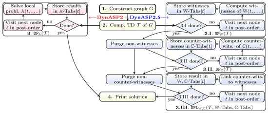 - Bliem, B.; Charwat, G.; Hecher, M.; Woltran, S. D-FLAT^2: Subset Minimization in Dynamic Programming on Tree Decompositions Made Easy. Fundam. Inf. 2016, 147, 27–34. [Google Scholar] [CrossRef]