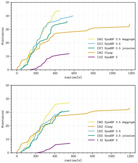 We mainly inspected the CPU time using the average over five runs per instance (five fixed seeds allow certain variance for heuristic TD computation). For each run, we limited the environment to 16 GB RAM and 1200 s CPU time. We used Clasp with options “--stats=2 --opt-strategy=usc,pmres,disjoint,stratify --opt-usc-shrink=min -q”, which enable improvements for unsatisfiable cores [], and disabled solution printing/recording. We also benchmarked Clasp with branch-and-bound, which was, however, outperformed by the unsatisfiable core options on all our instances. In fact, without using unsatisfiable core advances, Clasp timed out on almost every instance.