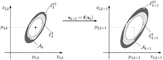 Predictor-corrector approaches for the model-based estimation of state variables and disturbances were presented in several previous research activities [1,2]. These approaches rely on predicting state enclosures for sets of ordinary differential equations either in an interval-based form [3,4], perform Taylor series expansions with respect to time as well as uncertain parameters and initial conditions [5], or employ Taylor model-based approaches [6,7]. However, these techniques are not directly capable of representing inner and outer bounds of the estimated domain in a unified manner as they were determined by means of affine sets [8], combinations of affine arithmetic with automatic differentiation [9], and data-driven overapproximation techniques for a reachability analysis [10] in current references. On the one hand, the predictor-corrector methods mentioned above provide guaranteed outer bounds of all state variables that are consistent with the state equations as well as with measured output information. Both, state equations and output models, the latter representing sensor characteristics with bounded noise, may include interval parameters to reflect limited knowledge and the influence of model simplifications. On the other hand, however, the lack of information concerning domains that belong to the exact sets of reachable states makes it impossible to distinguish between the phenomena of wide state enclosures as a consequence of uncertainty or the result of wide bounds due to pessimism in numerical evaluations. The latter aspect is well-known in the frame of interval analysis and denoted as overestimation that can be traced back to the so-called dependency effect (numerous variables are treated as independent despite underlying physical or mathematical correlations) or to the wrapping effect (complex-shaped solution sets are replaced conservatively by more simple outer bounds which are subsequently propagated further) [11,12,13,14].