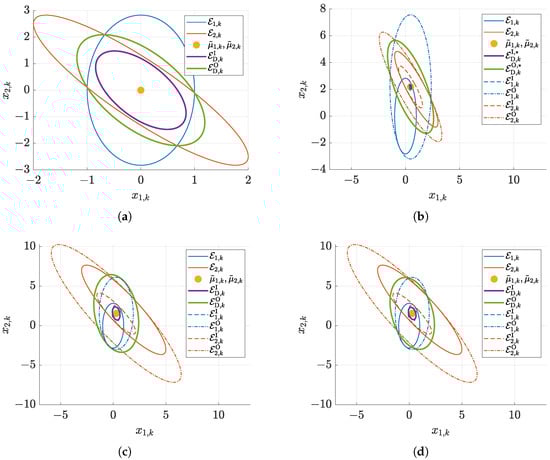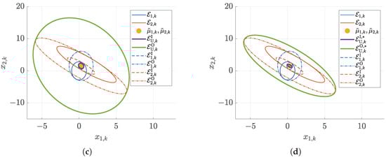 State estimation for the case of large uncertainties (91). (a) Outer ellipsoidal enclosures for the velocities and . (b) Enlarged view of the ellipsoidal enclosures of and . (c) Outer ellipsoidal enclosures for the velocities and . (d) Enlarged view of the ellipsoidal enclosures of and .