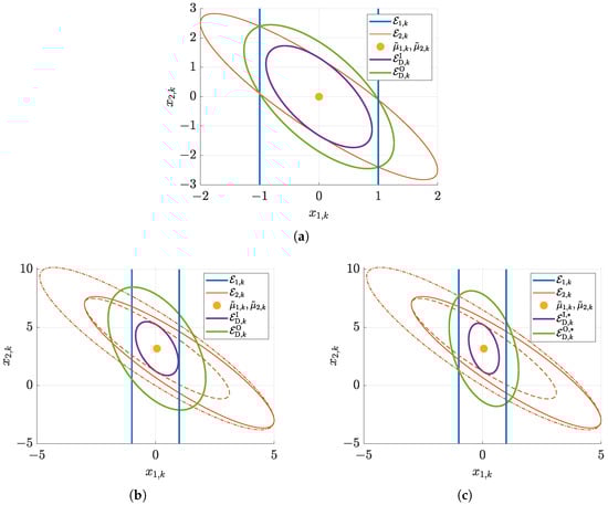 The optimal, i.e., smallest volume ellipsoid after fixing the matrix , for example, by the choice , is obtained with the help of Theorem 2 if the parameter is minimized by a line search procedure so that (22) remains satisfied. For , the outer bound becomes infinitely large.