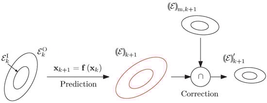 Previous work of the authors has focused on the development of thick ellipsoid function evaluations [20] and recursive simulation approaches [24], where the inner bounds represent the domains of certainly reachable states and the outer bounds reflect the worst-case uncertainty. So far, only extensions of sufficiently smooth function evaluations (the basic arithmetic operations of addition, subtraction, multiplication and division) as well as the evaluation of nonlinear standard functions (such as trigonometric or exponential functions) were investigated. In order to implement state estimation schemes, it is further necessary to define outer and inner solution enclosures in ellipsoidal form for union and intersection operators. These operators are investigated in more detail in this paper so that they form the basis for the implementation of a discrete-time state estimation procedure. The estimator’s structure resembles the one of a discrete-time Kalman filter [25] or of suitable generalizations for nonlinear systems [26,27,28,29], where a state prediction stage is employed to forecast future reachable states and this a-priori knowledge is subsequently refined in an innovation (i.e., correction) stage as soon as measured data become available.