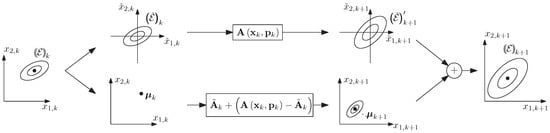 In general, the evaluation of system models in the form (7) is possible with the help of the general solution approach presented in [20,24] if an augmented state vector is introduced that contains not only the actual state variables but also the parameter vector in terms of discretized integrator disturbance models for which holds. However, the examples investigated in [24] have shown that doing so leads to conservativeness of the solutions. The reason for this observation is that the parameters become correlated with the state vector so that their outer bounds start to expand despite the aforementioned assumption of uncertain but temporally constant values. Hence, the methods summarized in this subsection (together with the intersection operators included in the state estimator according to Section 4) resolve the corresponding issue by introducing uncertain parameters as entries in the system matrix. When doing so, their enclosures may even be reset at each sampling instant k to new interval bounds. As shown subsequently, this option allows for analogously dealing with (outer) state bounds influencing the dynamics matrix .