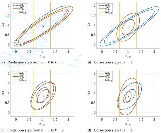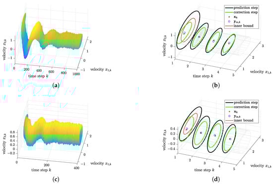Figure 10 and Figure 11 display the evolution of the outer state enclosures for steps of the estimation algorithm from Figure 6 in the left columns. In the right columns of these figures, an enlarged view is given which compares outer and inner bounds of the thick ellipsoid after the first prediction step, the propagation of the prediction results in terms of outer bounds and the respective corrected ellipsoids after accounting for the measured data. In addition, the measured and true state values are depicted.