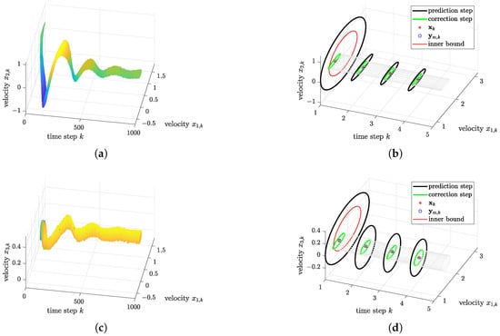 Throughout this section, the intersection of the predicted ellipsoids with the degenerate information according to (90) is performed by the application of formula (53). The gap between the outer and inner enclosures for indicates the non-negligible influence of nonlinearities for sufficiently uncertain values of . For the sake of forecasting the domains of reachable states, only the outer bounds are investigated further in Figure 12 and Figure 13. It can be seen that the smaller measurement uncertainty (92) leads to reduced uncertainty in the state reconstruction. Most noticeable, however, is the fact that the observer becomes also applicable to reconstruct bounds for the disturbance in this case which are tighter than their initialization and consistent with the system model as well as the uncertain state observations, cf. Figure 13d.
