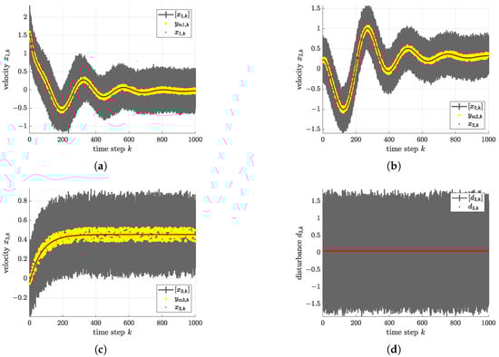 Comparison of the estimation results with noisy measurements and true system states for the case of small uncertainties (92). (a) Estimated bounds vs. measured and true velocities and . (b) Estimated bounds vs. measured and true velocities and . (c) Estimated bounds vs. measured and true velocities and . (d) Estimated bounds vs. true disurbance .