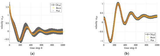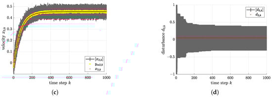 where , , are the data provided by the velocity sensors and their corresponding maximum uncertainty. Besides filtering the velocity signals, the proposed observer is used to reconstruct the ranges of the disturbance inputs that are compatible with the system model and the sensor data. Due to the assumption of constant but uncertain disturbances, see Equations (87) and (89), it is permitted to intersect disturbance estimates at a specific time step k with those of previous steps and to employ those intersected results as virtual measurements in analogy to the sensor models (90).