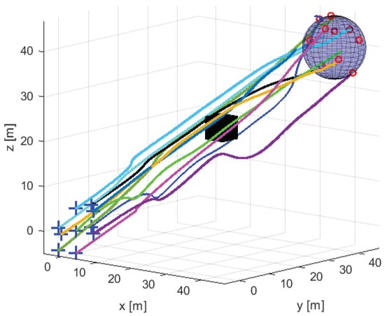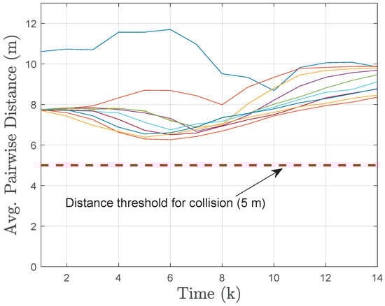 where is the location of an obstacle, is a collision threshold with the obstacle, and is a weighting parameter. The indicator function , if the argument b is true and 0 otherwise. The resulting motion of the scenario with the obstacle is shown in Figure 3. For this scenario, we also plot the distance between every pair of UAVs in the swarm, as shown in Figure 4. Here, we assume that there is a collision risk between a pair of UAVs when the distance between them is less than 5 m. Clearly, the Figure 3 and Figure 4 demonstrate that our decentralized algorithm drives the swarm to the destination while successfully avoiding collisions between the UAVs.