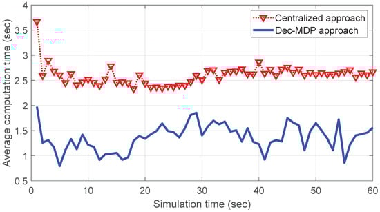 Different formation control settings have been studied in the past: ground vehicles [,,], unmanned aerial vehicles (UAVs) [,], surface and underwater autonomous vehicles (AUVs) [,]. Regardless of settings, there are many different methodologies developed by the researchers to tackle formation control problem, e.g., behavior-based, virtual structure, and leader following. The authors of [,] developed a behavior-based approach in which they described the desired behavior for each robot, e.g., collision avoidance, formation keeping, and target seeking. The control commands for the robot is determined by weighing the relative importance of each behavior. The virtual structure approach [,] takes a physical object shape as a reference and mimics the formation of that shape. The robots are required to communicate with each other in order to achieve a formation in this approach which requires significant communication costs (e.g., bandwidth). The leader following approach [] requires a robot, assigned as a leader, which moves according to a predetermined trajectory. The other robots, the followers, are designed to follow the leader, maintaining a desired distance and orientation with respect to the leader. The main drawback of this approach is that the followers are dependent on the leader to achieve the goal (formation). The system may collapse if the leader fails when the leader possibly runs short on power or when the communications link fails. Considering the aforementioned limitations of formation control, which specifically stem from centralized approaches, we develop a decentralized Markov decision process (Dec-MDP)-based formation control approach for a UAV swarm. Our decentralized control strategies are robust to failures of individual UAVs in the swarm and also robust to communications link failures.