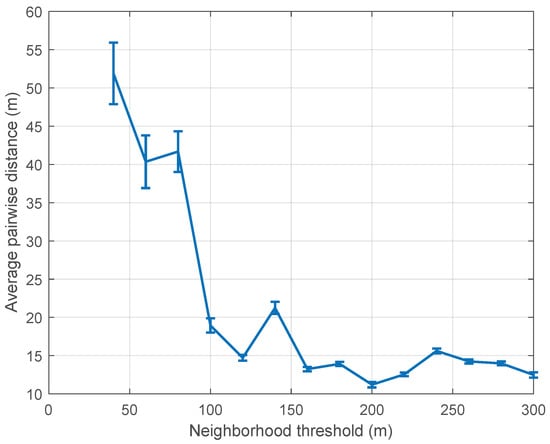 We also expect that with the increase of neighborhood threshold, average pairwise distance drops. The reason we are interested in analyzing average pairwise distance is, we expect the swarm to be as close as possible while avoiding collision between UAVs. Small average pairwise distance allows the swarm to be more cooperative while saving battery life as communication distance depends on distance between UAVs. Figure 6 and Figure 7 suggest that a neighborhood threshold of more than 130 m allows UAVs to stay close in the swarm with reasonable computation cost.