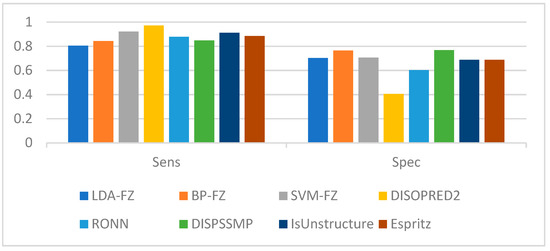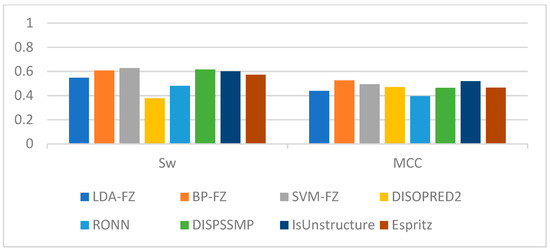 Using the data in the table we find that for LDA and SVM, when the window size is larger than 35, the values tend to be smooth; for BP neural networks, when the window size is larger than 60, the values tend to be smooth. Therefore, we use a window length of 35, 60 as the selection window length for the corresponding algorithm. As a comparison, we run our scheme together with some of the best-known schemes, such as Espritz [14], DISOPRED2 [15], RONN [24], DISPSSMP [25] and IsUnstructure [9] on the dataset R80 which are comprised of 78 protein sequences. Table 7 shows the prediction results of these learning methods on the test set; in Figure 5 and Figure 6 we have visualized these results to make the comparison between the different algorithms more intuitive.