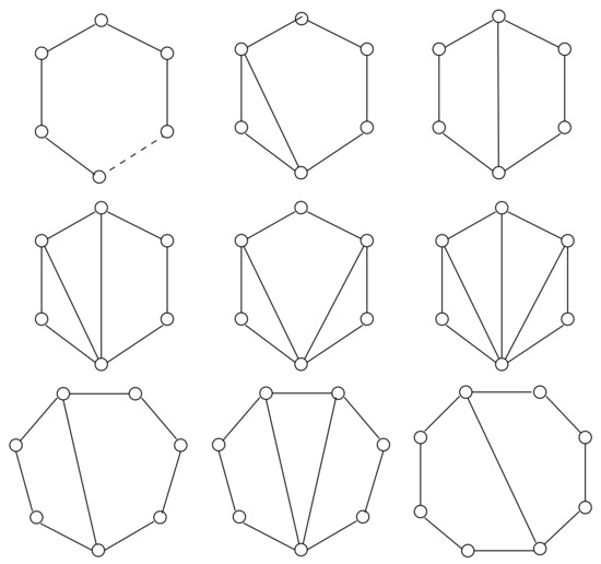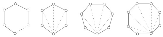 - Suppose by contradiction that . Then, there must exist chords with both and different from . To each chord not incident on , we associate a “length” defined as . Now, let , with , be a chord with minimum length. By definition, holds. Since is a , then , and hence results to be a cycle with at least 5 vertices. Moreover, between and , for each , , cannot exist an edge, otherwise it would be a chord with length smaller than .