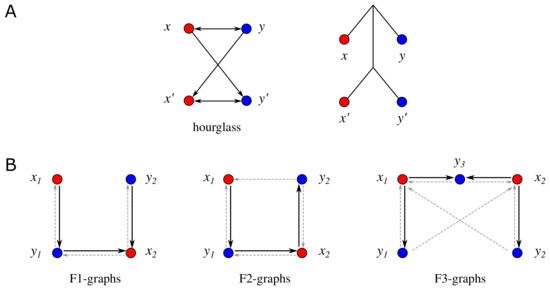 (A) An hourglass as the characteristic forbidden induced subgraph of beBMGs and its non-binary explaining tree. (B) The three classes of forbidden induced subgraphs of 2-colored BMGs (see Definition 6 below). The gray-dashed arcs may or may not exist.