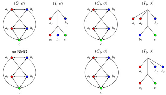 We will now show that for every (not necessarily optimal) completion of the 2-BMG to a beBMG. To this end, consider an arbitrary arc . If , then follows immediately. Now, assume that . As is a 2-BMG and thus properly-colored and sink-free (cf. Proposition 4), there must be a vertex of color such that . As , we have and thus the LRT displays the triple . However, implies that does not display the triple , i.e., all edges on the path from to have been contracted. Therefore, there is a -maximal inner vertex such that , is not a star tree and u has support leaves of both colors in T. By the arguments above, we can conclude that .