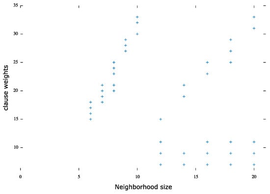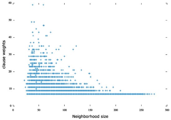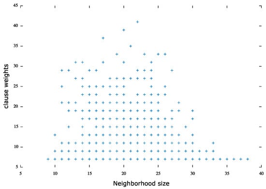 The weights and their distribution were the core component of this study. Therefore, we extensively studied the weights and their distributions for all problems under consideration. This was done through an experimental study of the distribution of the weights, which began by recording the weights and their changes for all the problem clauses. Then, we compared the clauses’ weights and whether those clauses were located in a neighborhood of small, medium, or large size. This comparison aimed to determine whether the clause weights correlated with the size of the neighborhoods in which they were located. As we expected, this appeared clearly in all the problems under discussion, as follows: