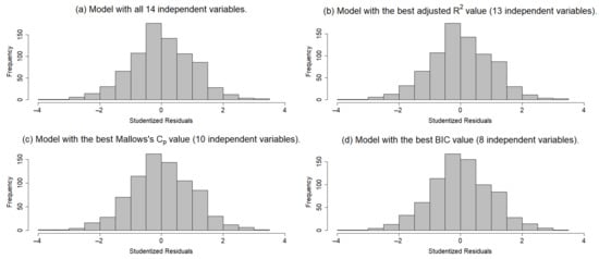 We use adjusted R2, Studentized residuals, Mallows’s , and Bayesian information criterion (BIC) to assess the quality of the model fits. Residuals () have a mean of zero. Studentized residuals are scaled residuals with unit variance. Mallows’s and BIC are used in the context of model selection where the goal is to find the best model involving a subset of the independent variables. Mallows’s addresses the issue of model overfitting by penalizing for adding extra variables. The value of Mallows’s should be close to the number of independent variables in the model (p) to indicate the absence of overfitting. BIC penalizes a model for having more independent variables, and the penalty increases as the number of instances (size of the data set) increases. The lower the value of BIC, the better is the model fit.