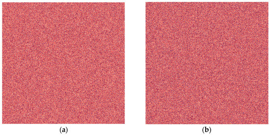 This encryption algorithm for hiding the plain image in Figure 2 in a cipher image is shown in Figures 4 and 8. In Figure 4, the cipher images are the diagrams of the results of the randomization of the original image pixels using a 2D ACM linear map from Equation (24) (Figure 4a) and the 2D sine-Gordon linear map from Equation (23) (Figure 4b). The key parameter values that must be kept secret are µ, p, q, and number of iterations of the map (N). The decryption process requires the same key parameters to retrieve the plain image. To obtain the cipher images based on 2D ACM, we used Equation (24) for and Equation (23) for , respectively.