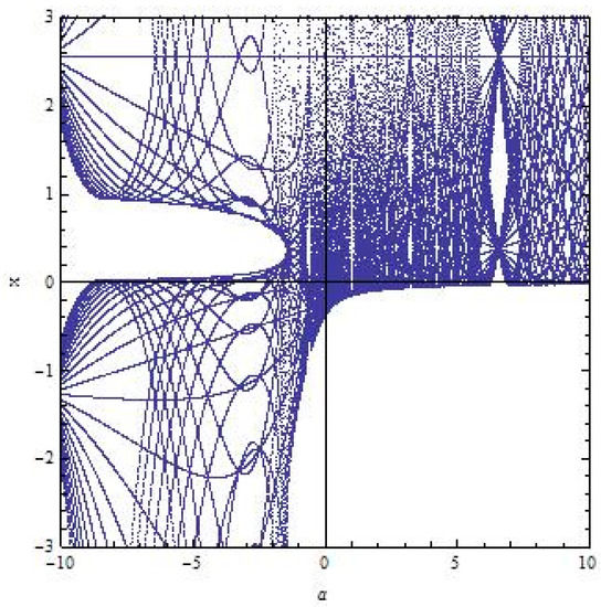 We have already seen that in Figure 6, Figure 7 and Figure 8, different values of the parameter may yield qualitatively different solutions. We are especially interested in the changing nature of solutions as the parameter is varied. To investigate such changes, we shall use the bifurcation diagram plot for all linear maps discussed in this article. Next, we will show the bifurcation diagrams for the 2D linear ACM in Equation (24), sine-Gordon in Equation (23), and mKdV map in Equation (31). These maps have as a fixed point. Using Mathematica, the bifurcation diagrams around can be obtained and are shown in Figure 10, Figure 11 and Figure 12.