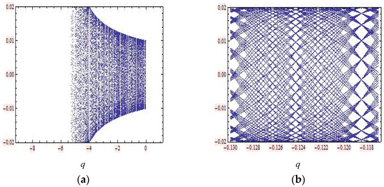 For the bifurcation diagram in Figure 10, we fixed p = 0.75 and use a parameter q in bifurcation plots. First, we started with the bifurcation diagram where , with 300 steps; 200 is the number of the first iteration shown, 150 is the maximum number of iterations, and (0.01, 0.01) is the starting point of the iteration. The range in the vertical axis is set to (−0.02, −0.02). Zooming in, we acquired an interesting “net pattern”. The bifurcation values for the periodic solutions of periods 19 can be located precisely on this plot with around . In the same procedure, to produce the bifurcation diagrams in Figure 11, we used the parameter values of in bifurcation plots. Zooming in, we acquired an interesting “net pattern”. The bifurcation values for the periodic solutions of periods 21 can be located precisely on this plot with around . As for the 2D sine-Gordon map, to produce the bifurcation diagrams for the 2D mKdV map, as shown in Figure 12, we fixed a parameter in bifurcation plots. This gave us the same bifurcation diagrams as with the 2D sine-Gordon map.