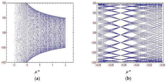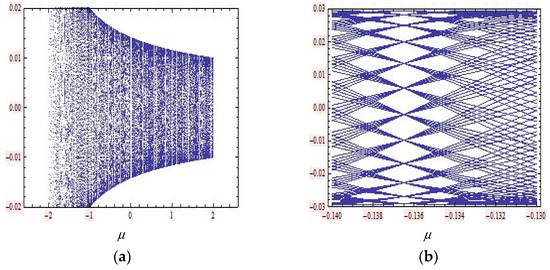 Two bifurcation diagrams of the 2D sine-Gordon linear map in Equation (23) around fixed point . (a) Bifurcation diagram for plotting . (b) Bifurcation diagram for zooming around .