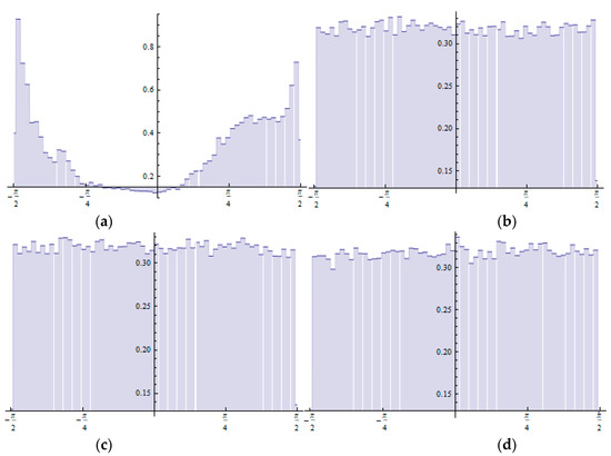 Histogram distributions based on weighted data: (a) Distribution of the plain image (before encryption). (b) Distribution of the cipher image after encryption with ACM in Equation (24). (c) Distribution of the cipher image after encryption with the 2D linear map in Equation (23). (d) Distribution of the cipher image after encryption with the 2D linear map in Equation (31).