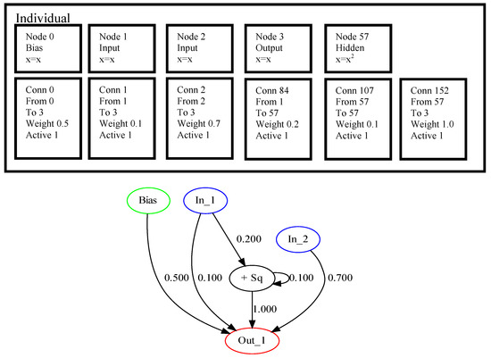 The upper part of Figure 1 shows the nodes and connections, where numbers are assigned to each of them. The node with number 57 is added after mutation, and it is the 57-th innovation since the beginning of the search process. Here, only the hidden node has some specific operation, while all others perform no transformation on the available data, and in node 57 the input values are squared. The connection genes also have innovation markers, which are assigned during mutation operations. Each connection node keeps the source and destination nodes, marked by innovation numbers, as well as weight coefficient. In addition, the activation flag is set for every connection to allow simple deactivation of them. The three added connections have innovation numbers 84, 107 and 152, and connection 107 makes a loop, i.e., it connects the output from node 57 to itself. The lower part of Figure 1 shows the graphical representation of the encoding as a directed multigraph.