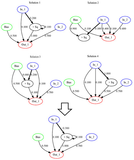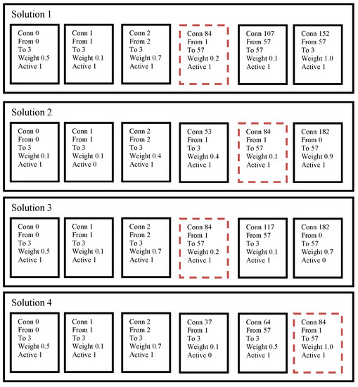 Figure 3 shows the result of DBM application to the solutions shown in Figure 2. In Figure 3 the highlighted connections have innovation number 84, and the first solution is considered as current, and the rest three are the randomly chosen ones. The scaling factor F is set to 0.5, so according to Equation (4) the resulting weight equals −0.3.