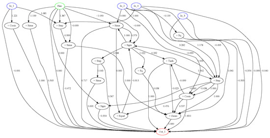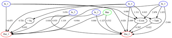 • Add connection: two nodes are selected randomly, and connected to each user. The weight of the connection is assigned randomly in the following way: first a random value from [0,1] is generated, and if it is smaller then 0.5, then the weight is set as a normal distributed random number with a mean equal to 0 and standard deviation set to 0.1 ( n o r m r a n d ( 0 , 0.1 ) ). Otherwise, the weight it set close to 1, i.e., n o r m r a n d ( 1 , 0.1 ) . A new innovation number is assigned to the connection.