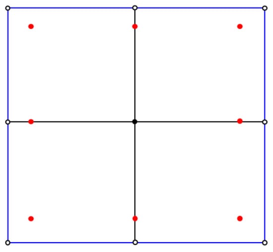 In this paper, the spatial discretization of Equation (12) adopts partially discontinuous elements. As shown in Figure 1, the blue lines represent the boundary of the surface, the black lines represent the edges of the mesh elements, the hollow dots represent the original element nodes, and the red solid dots represent the element collocation points which are moved inward. The nodes located on the surface but not on the edges (such as black solid dots in Figure 1) remain unchanged. It can be seen that in the partially discontinuous element, only the nodes located at the corner points are shrunk to the surface, and other nodes remain unchanged. Therefore, the partially discontinuous element can avoid the discontinuity problem of physical variables at the corner points without adding too many nodes. It is a compromise between the continuous element and the completely discontinuous element.