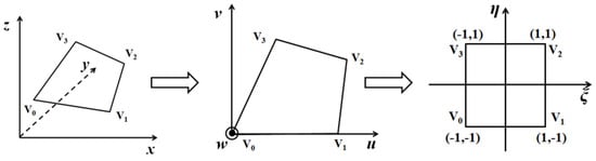 in which or , represents the shape function of the partially discontinuous element. Equation (13) is usually numerically calculated by the Gauss–Legendre quadrature method. Before applying the Gauss–Legendre quadrature method to Equation (13), the coordinate system should be transformed from the real 3D space xyz to the regular space ξηw, as shown in Figure 2.