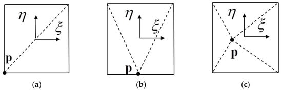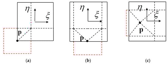 The improved element subdivision method: (a) p is located at the corner; (b) p is located on the edge; (c) p is located in the element.