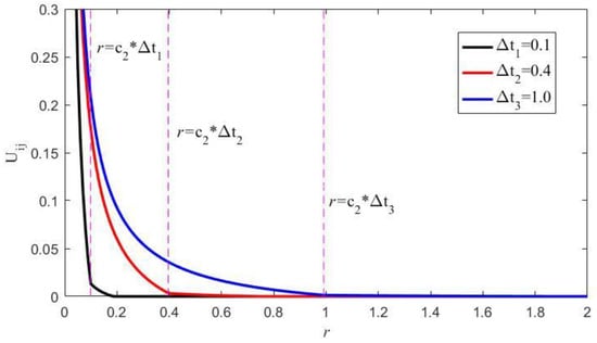 However, the value of the fundamental solutions of elastodynamics is related to the time step. As shown in Figure 5, the curves of the displacement kernel function are different under different time steps. In Figure 5, r represents the distance between the source point p and the field point q. It can be seen that the function value changes rapidly when r < c2Δt, in which c2 represents the shear wave velocity and Δt represents the time step. The smaller the time step Δt, the more drastically the function value changes.