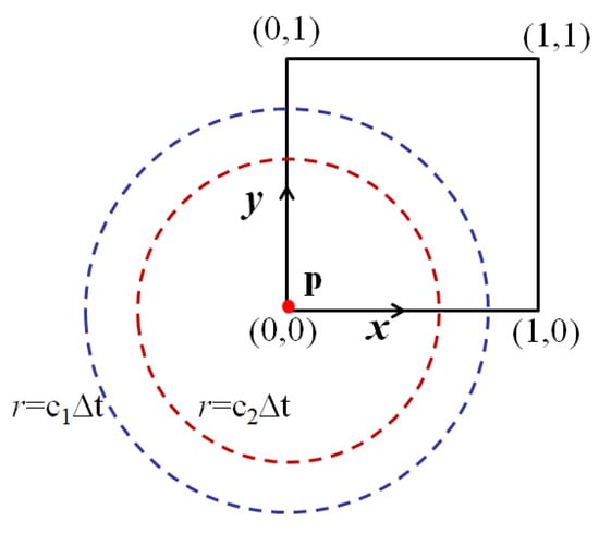 - Create a square with the source point p as the center and 2 c2Δt as the side length. If the square exceeds the boundary of the element (as shown by the red dashed lines in Figure 6), the boundary of the element is taken as the boundary of the square;