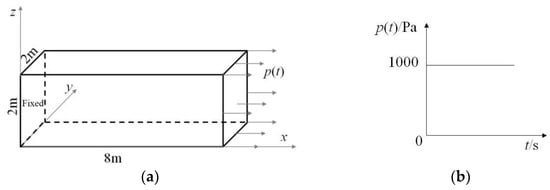 The geometric model used in this example is shown in Figure 8. The left end of the beam is fixed, and the right end is subjected to a Heaviside-type load p(t) = 1000 H(t) Pa. The material parameters of the beam are Young’s modulus , density , and Poisson’s ratio .