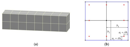 The discretized mesh model is shown in Figure 9a, which includes 72 linear quadrilateral elements and 126 nodes. In this model, the nodes located at the corner points are shrunk to the surfaces in proportion (as shown in Figure 9b), where a represents the moving distance of the node and b represents the edge length of the element.
