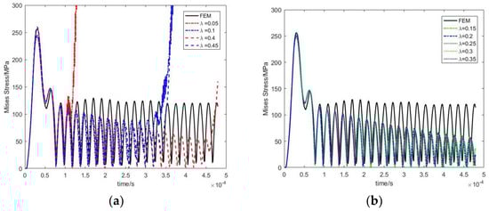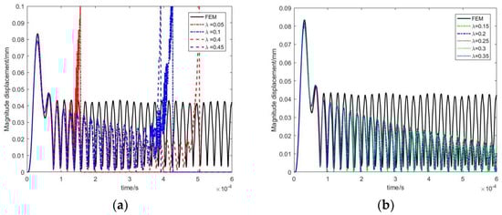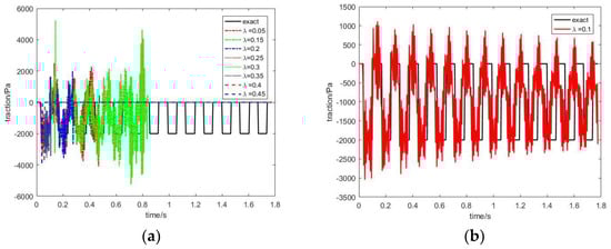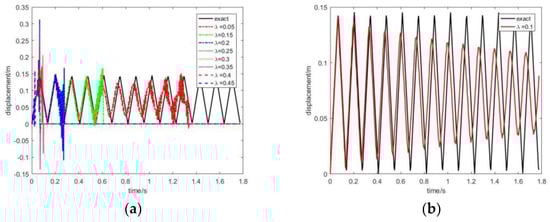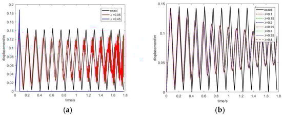 When , the displacement response at the free end and the traction response at the fixed end under different λ values are shown in Figure 10 and Figure 11, respectively. In these two figures, the left picture and the right picture show unstable results and stable results, respectively. It can be seen that the results are unstable when and . The results are stable when , and the result curves overlap each other in these cases. Therefore, the value of should avoid being too large or too small, and the computational accuracy is insensitive to the value of λ if the results converge.