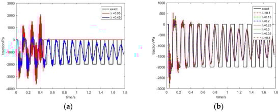 Under the same conditions, if completely discontinuous elements are used for discretization, the mesh model contains 72 linear quadrilateral elements and 288 nodes, which are greater values than those using partially discontinuous elements. The displacement response at the free end and the traction response at the fixed end under different λ values are shown in Figure 12 and Figure 13, respectively. It can be seen that the results tend to be stable only when , and the results are unstable in other cases. This demonstrates that the performance of the completely discontinuous element is very sensitive to the position of the element node. An inappropriate node inward shrink ratio can easily cause unstable results, so it is not suitable for the time-domain BEM.