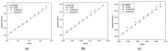 In order to verify the effectiveness of the improved singular element subdivision method proposed in Section 3.2, we compared the accuracy of the results before and after the improvement. It should be mentioned that the partially discontinuous element is adopted in the following study. Since the singular integral only appears in the first analysis step, we select the results of the first ten analysis steps to clearly observe the difference between the results before and after the improvement. The comparison results under the time steps , , and are shown in Figure 14a–c, respectively. In the figures, the “Exact” curve represents the exact solution, the “Traditional” curve represents the results before the improvement, and the “Improved” curve represents the results after the improvement. It can be seen that the improved results are in better agreement with the exact solutions. The results before the improvement become unstable as the time step decreases. This demonstrates that the improved singular element subdivision method can reduce the side effect of the time step on the stability of the result and effectively improve the accuracy of the singular integration. However, it should be noted that although the proposed subdivision method has improved the result accuracy in the first ten steps, the computational error becomes larger and larger with the accumulation of time steps, and instability results may still appear. The subdivision method proposed in this paper cannot completely solve the stability problem of the time-domain BEM but can improve the stability of the result.
